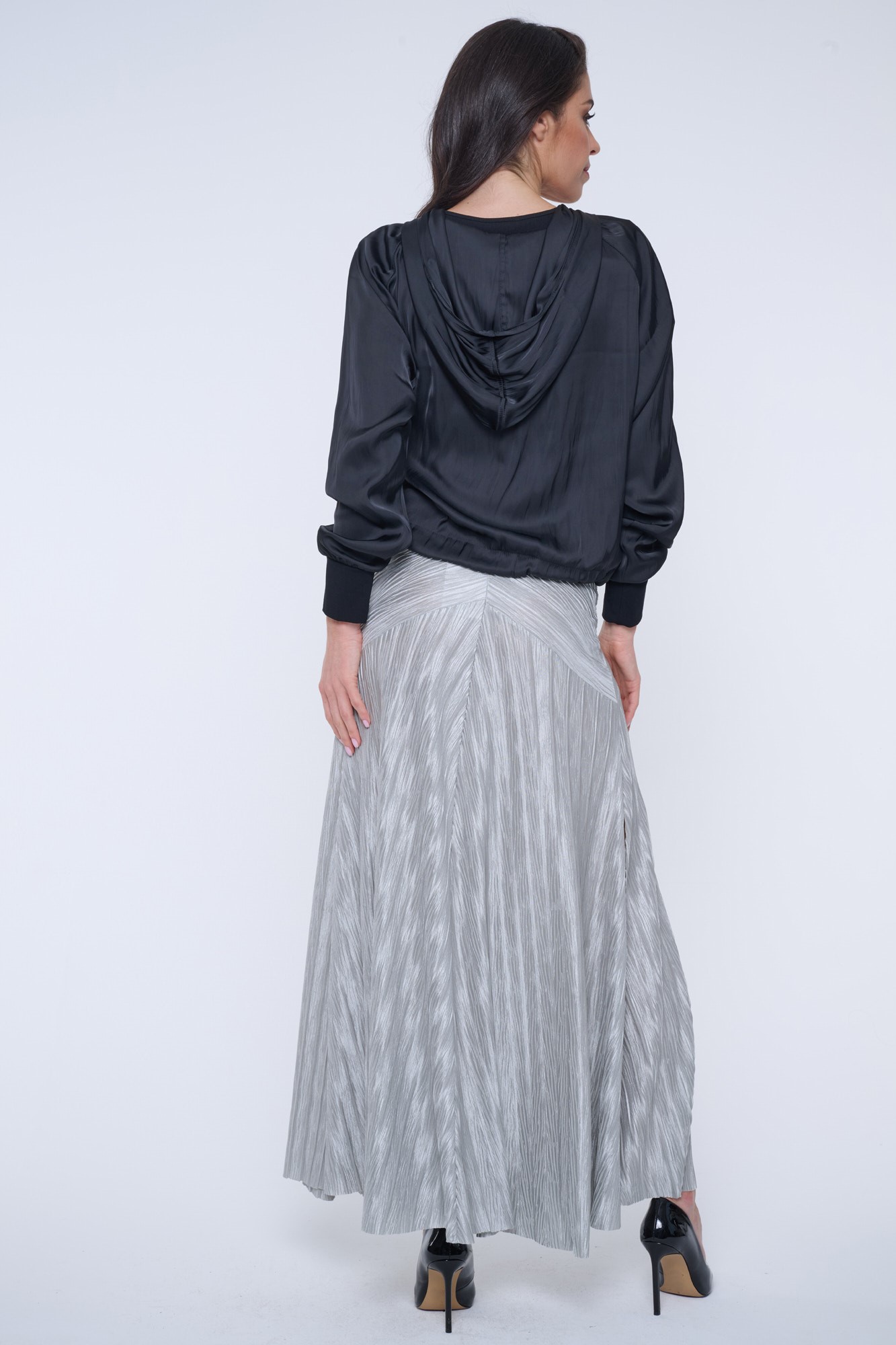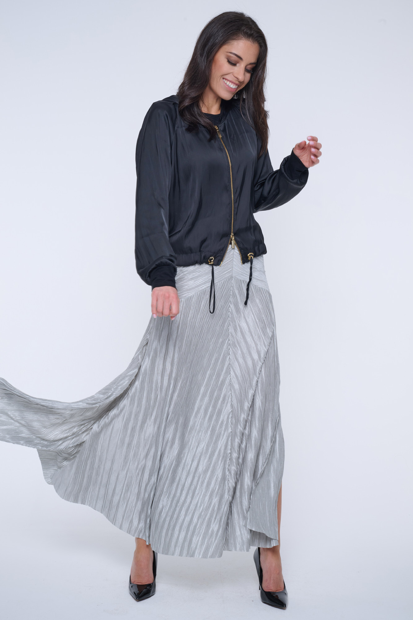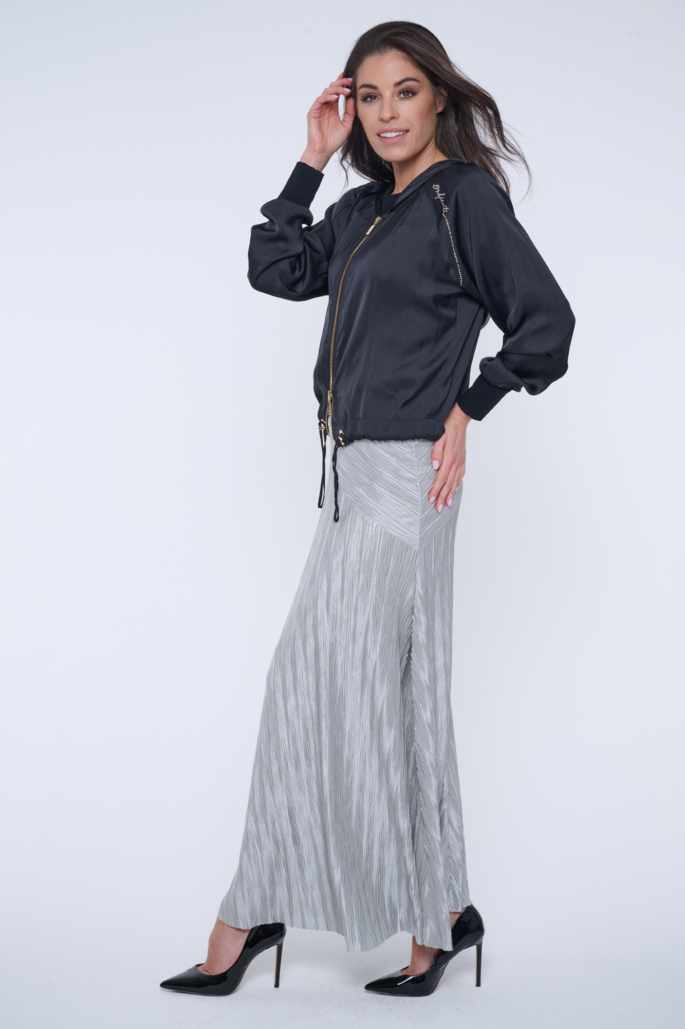 Černý letní "bomber" s kapucí z nového typu materiálu - odlehčeného saténu s memory efektem. Na kapuci nápis Infinite ze zlatých krystalů Preciosa.