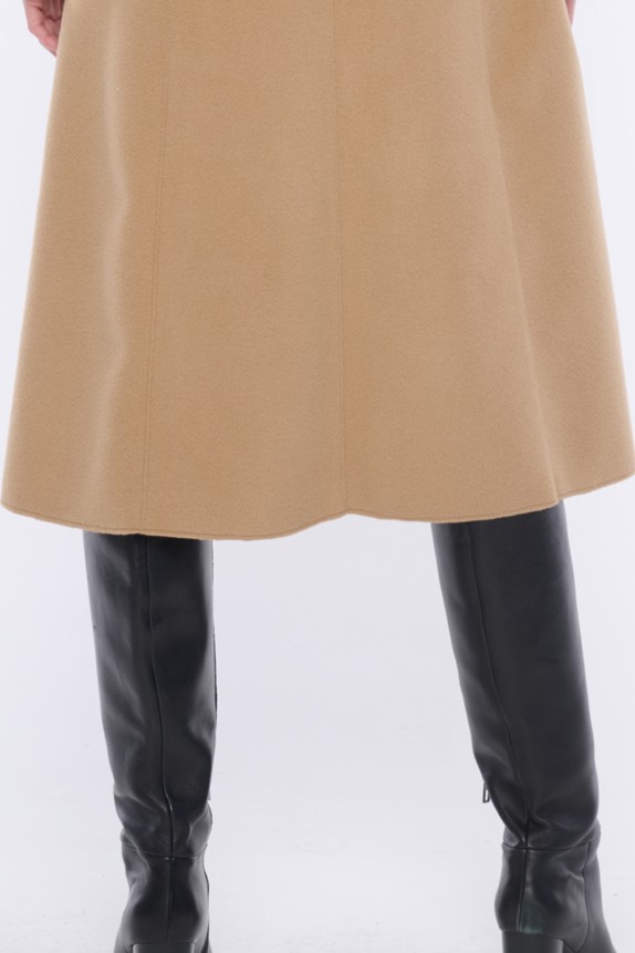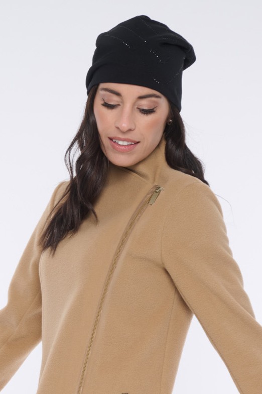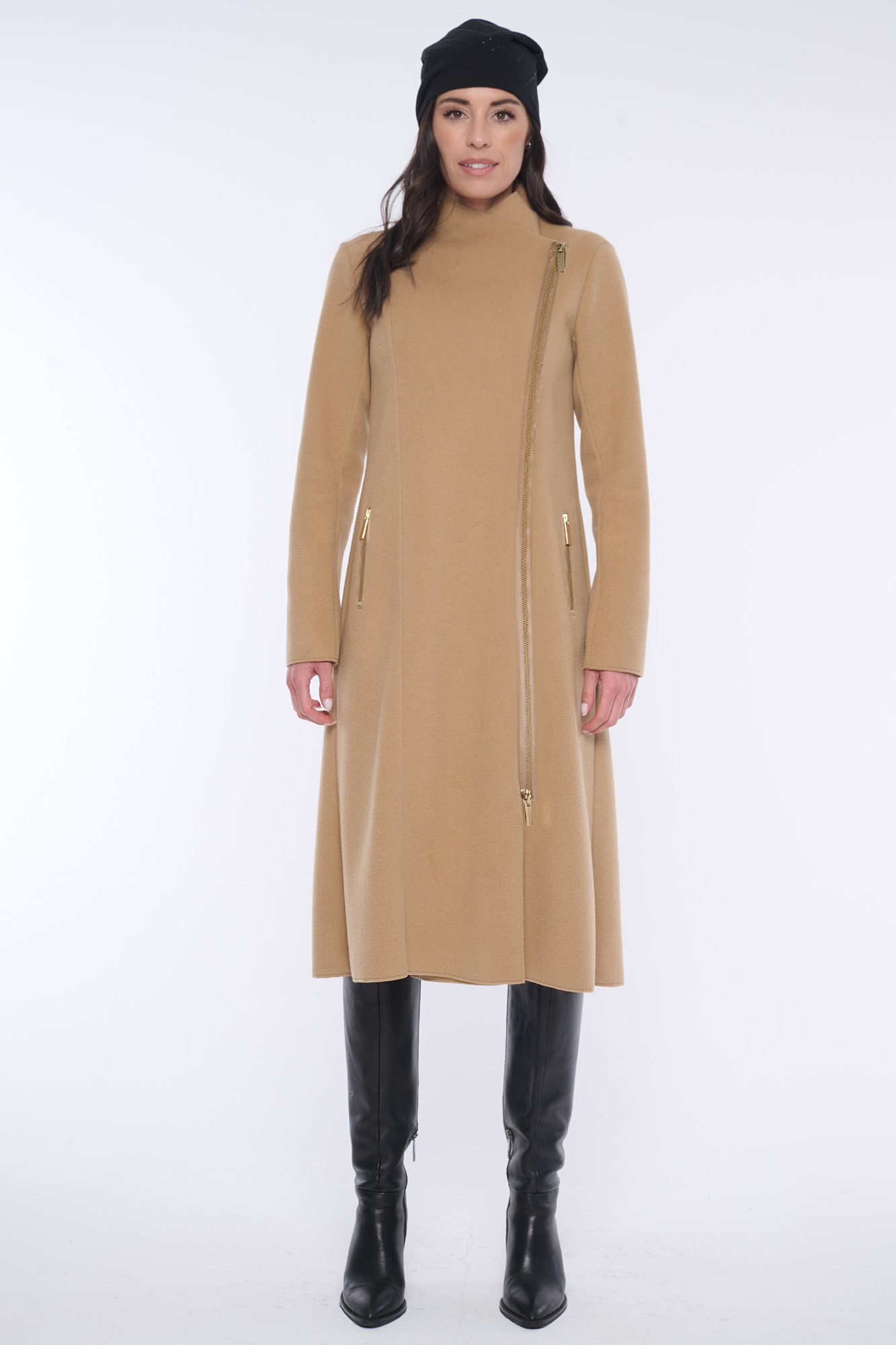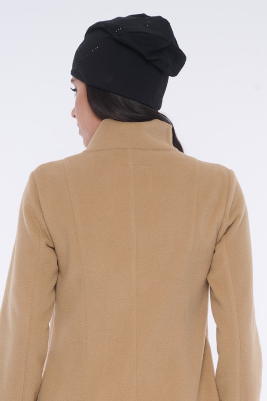 Kabát "křivák" z módního flauše bez podšívky. Kabát je vyroben z flauše, který je sám o sobě mírně elastický. Zlaté doplňky.