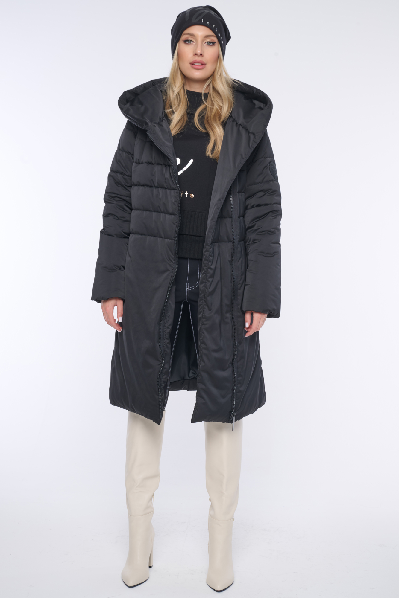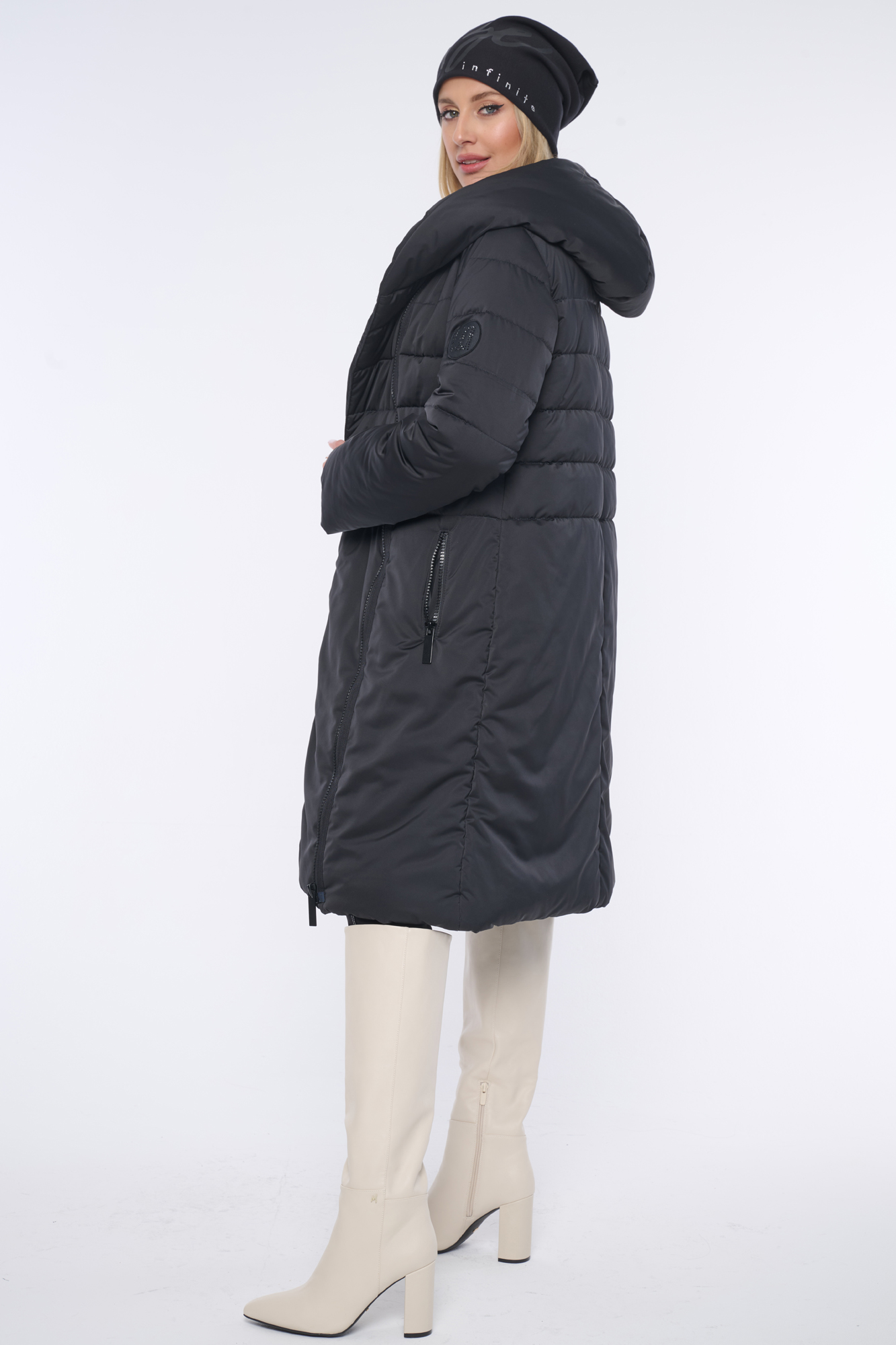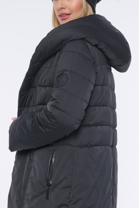 Luxusní prošívaná zimní bunda s velmi měkkým rounem. Když ji obléknete, cítíte se "jako v peřince". Délka do pasu. Na rukávu nášivka s logem INF z černých krystalů Preciosa. Efektní zip.