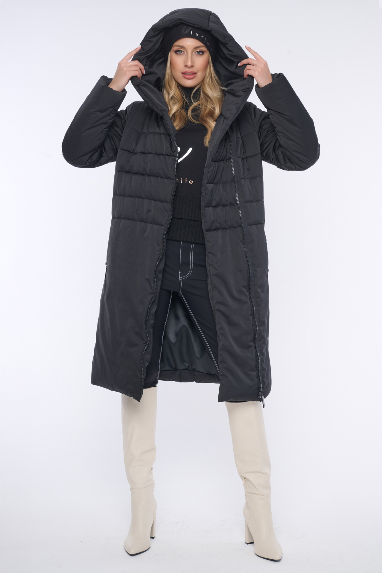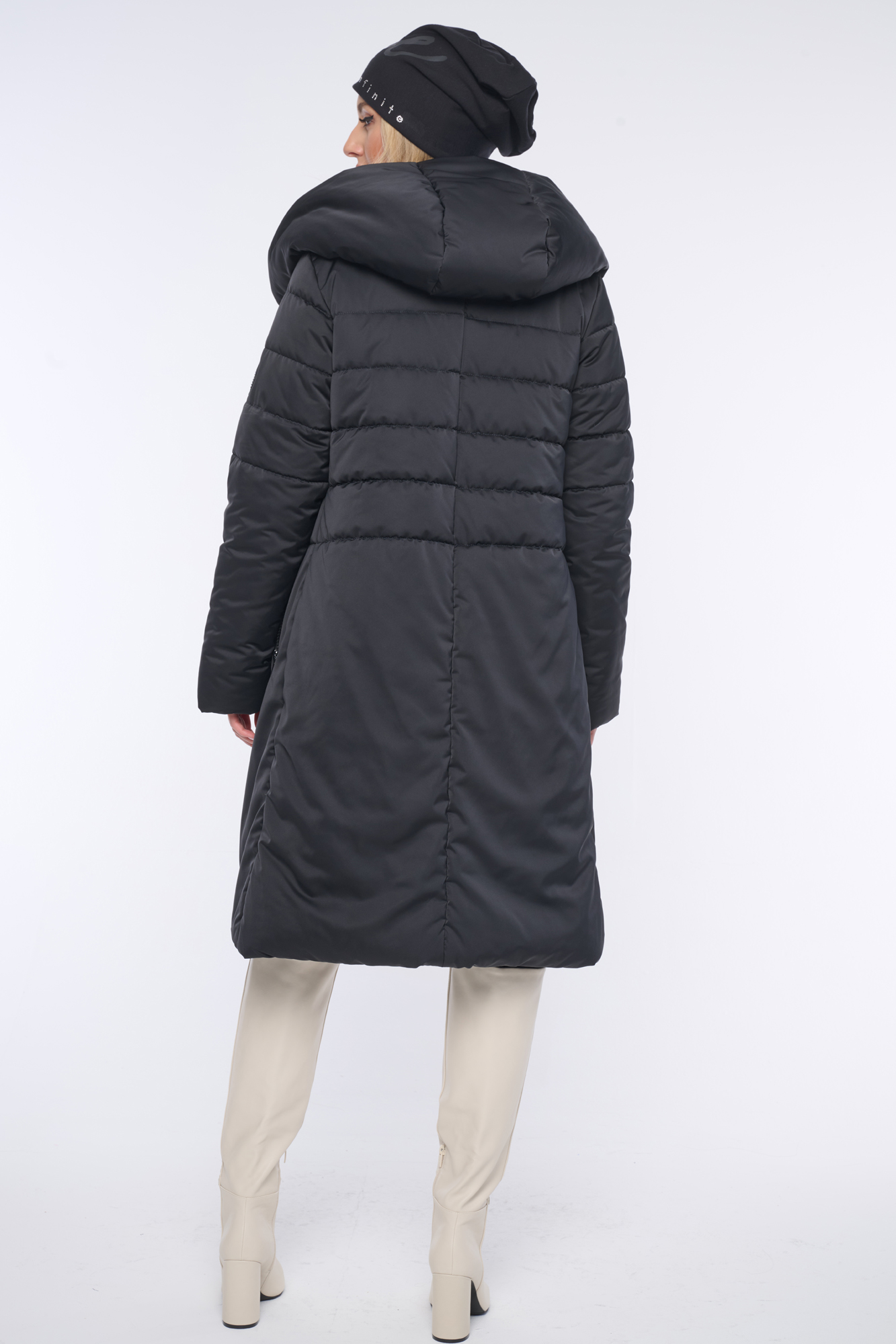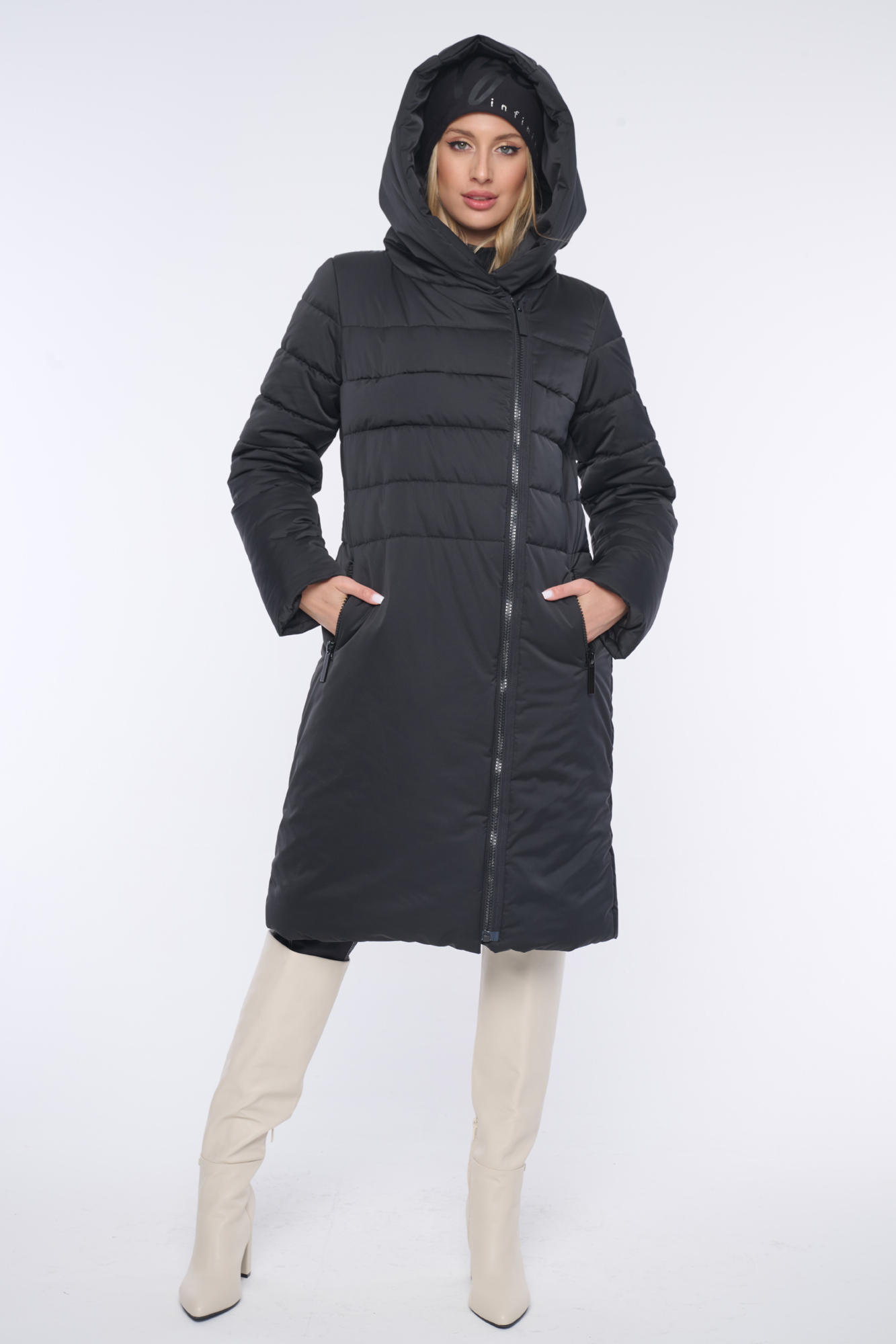 Luxusní prošívaná zimní bunda s velmi měkkým rounem. Když ji obléknete, cítíte se "jako v peřince". Délka do pasu. Na rukávu nášivka s logem INF z černých krystalů Preciosa. Efektní zip.