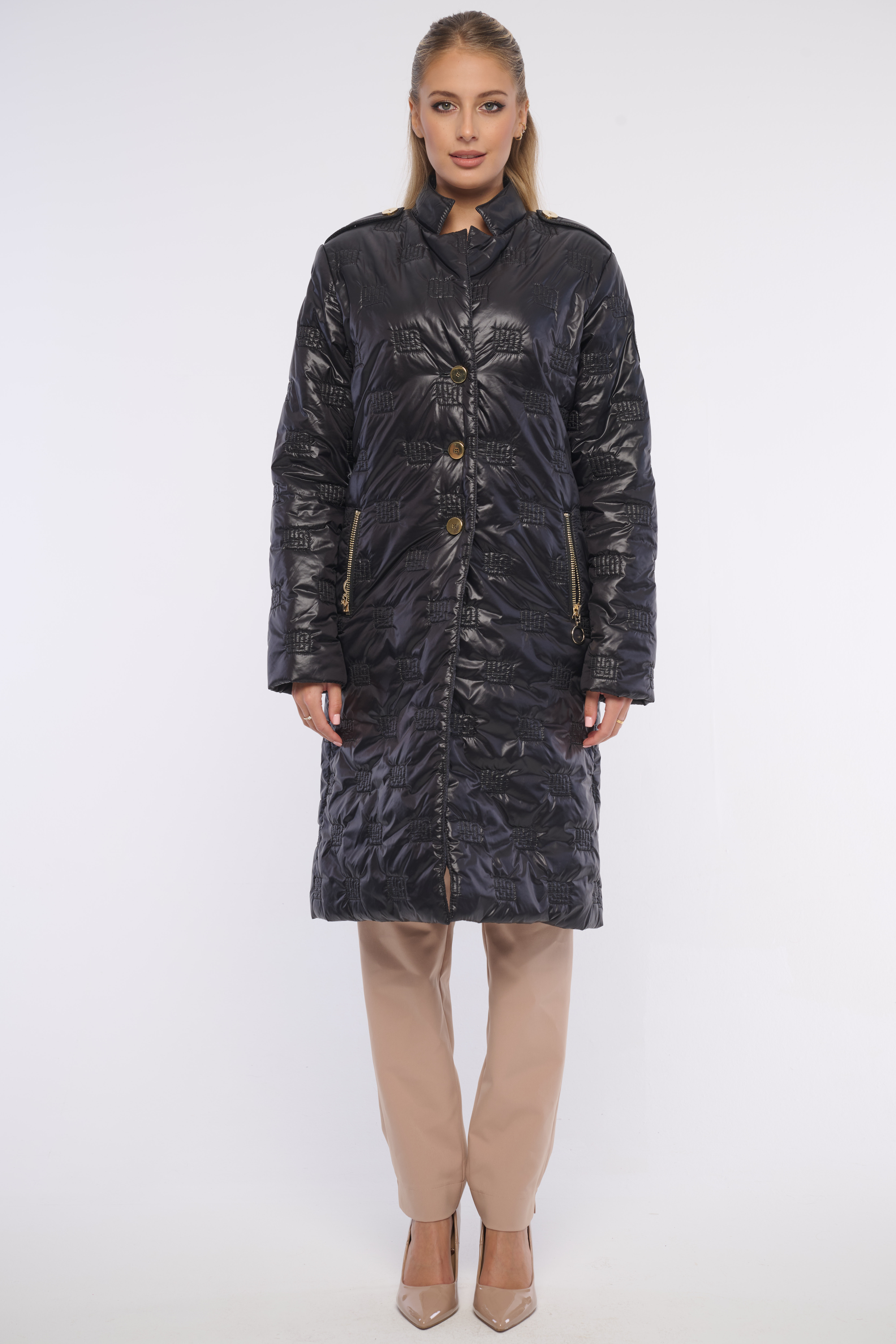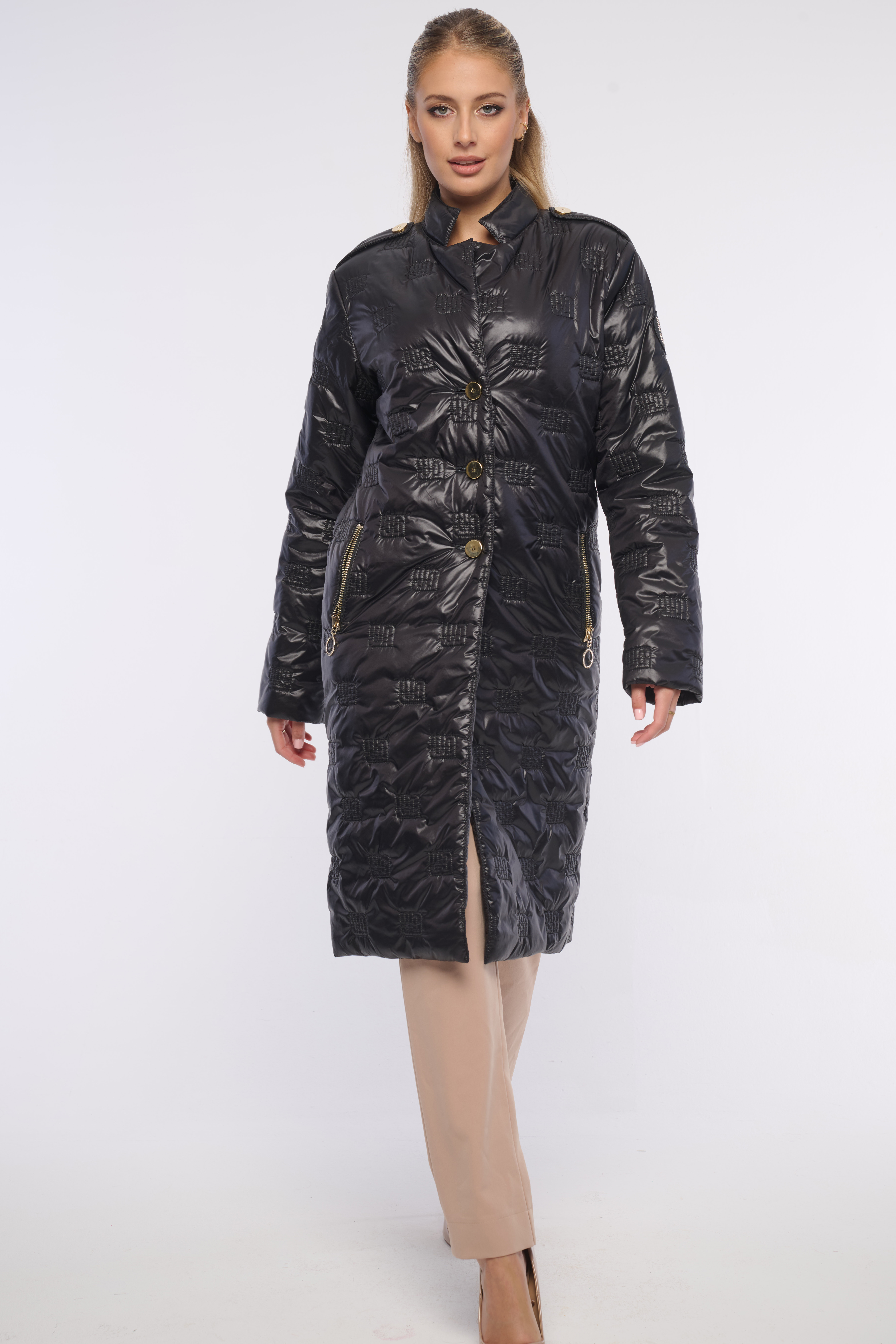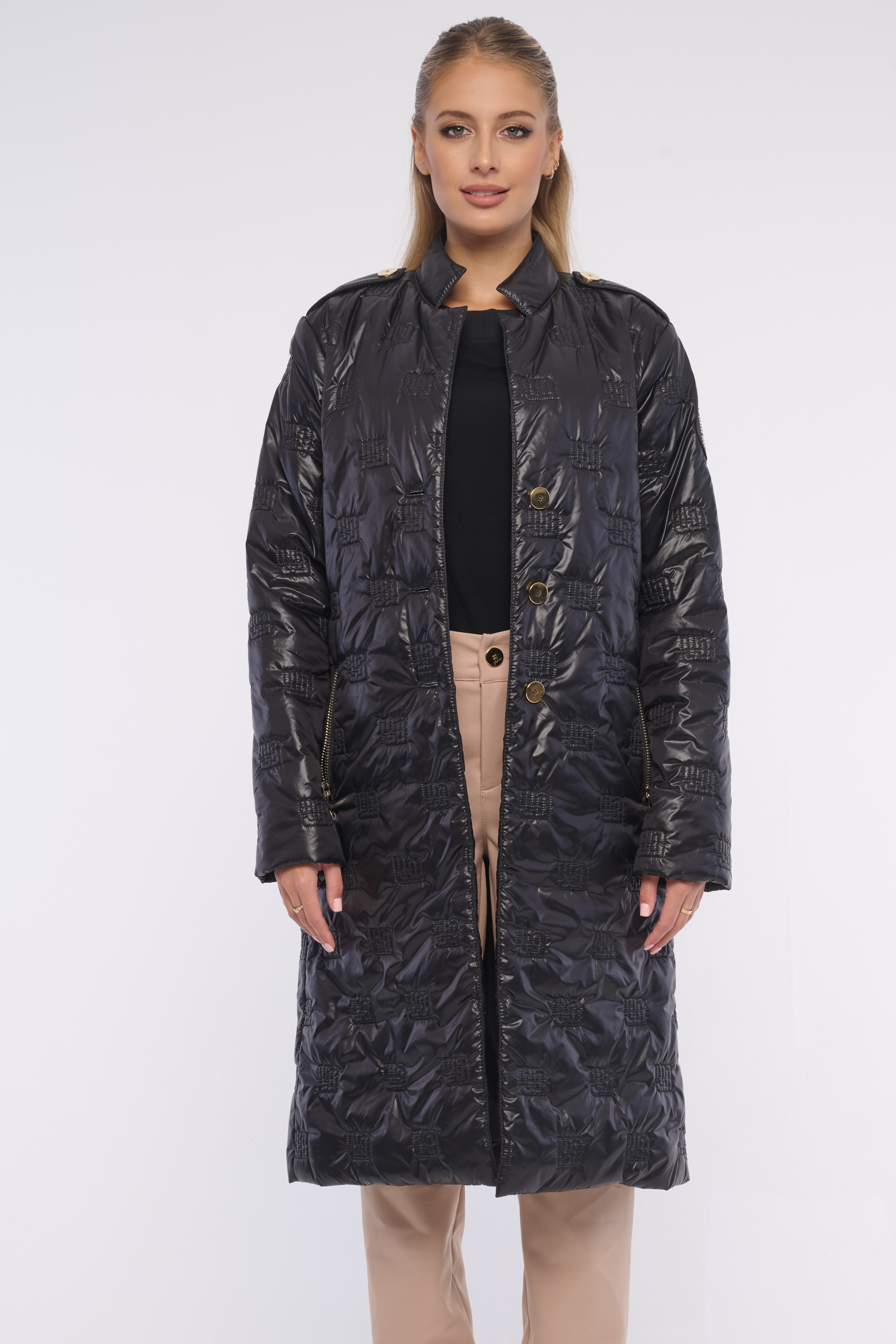 Dlouhý lehký šusťákový kardigan s prošitými logy se zlatými knoflíky a výraznými zipy. Detail na rameni tvoří nášivka s logem z luxusních krystalů Preciosa. Dostupný ve dvou barevných variantách.