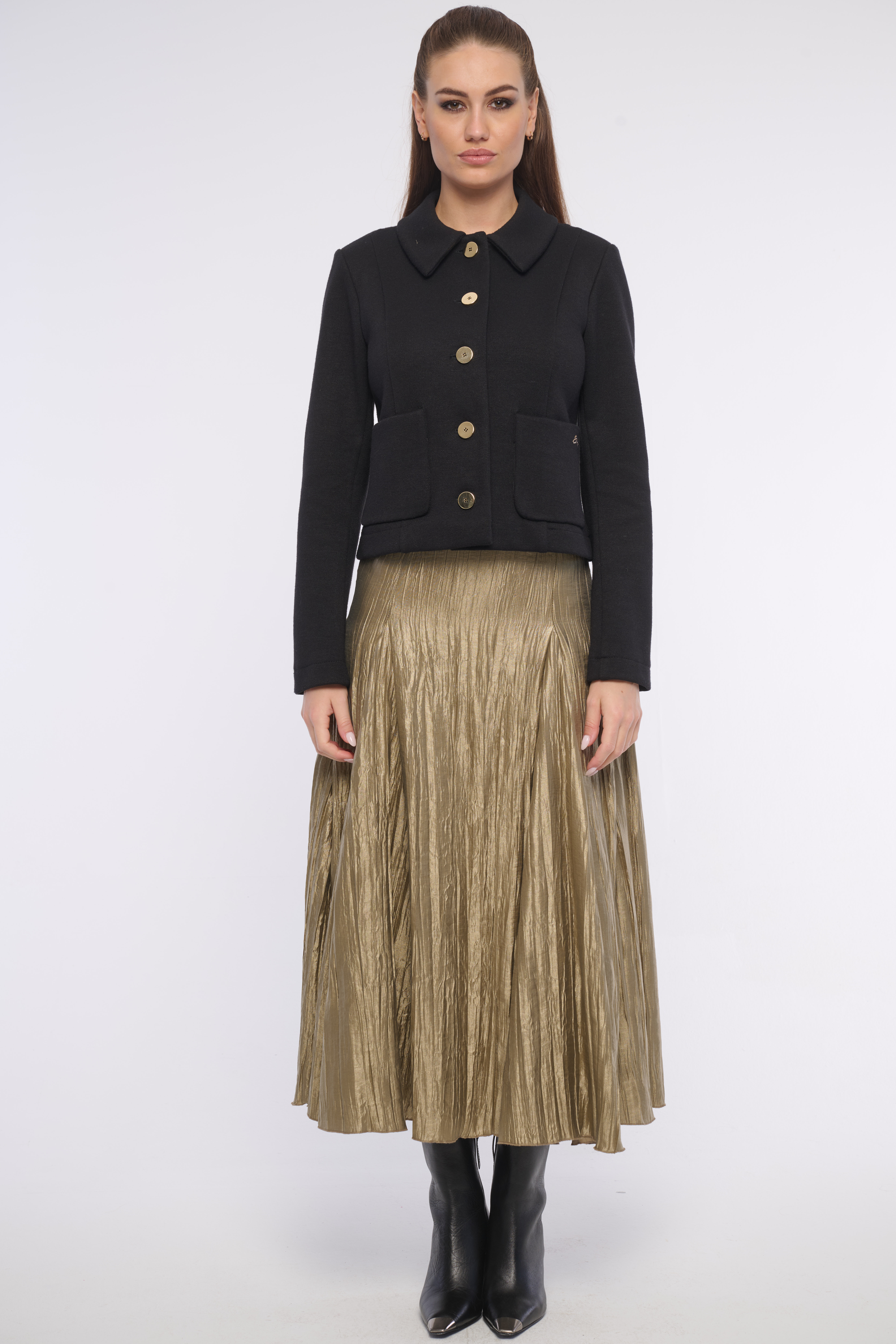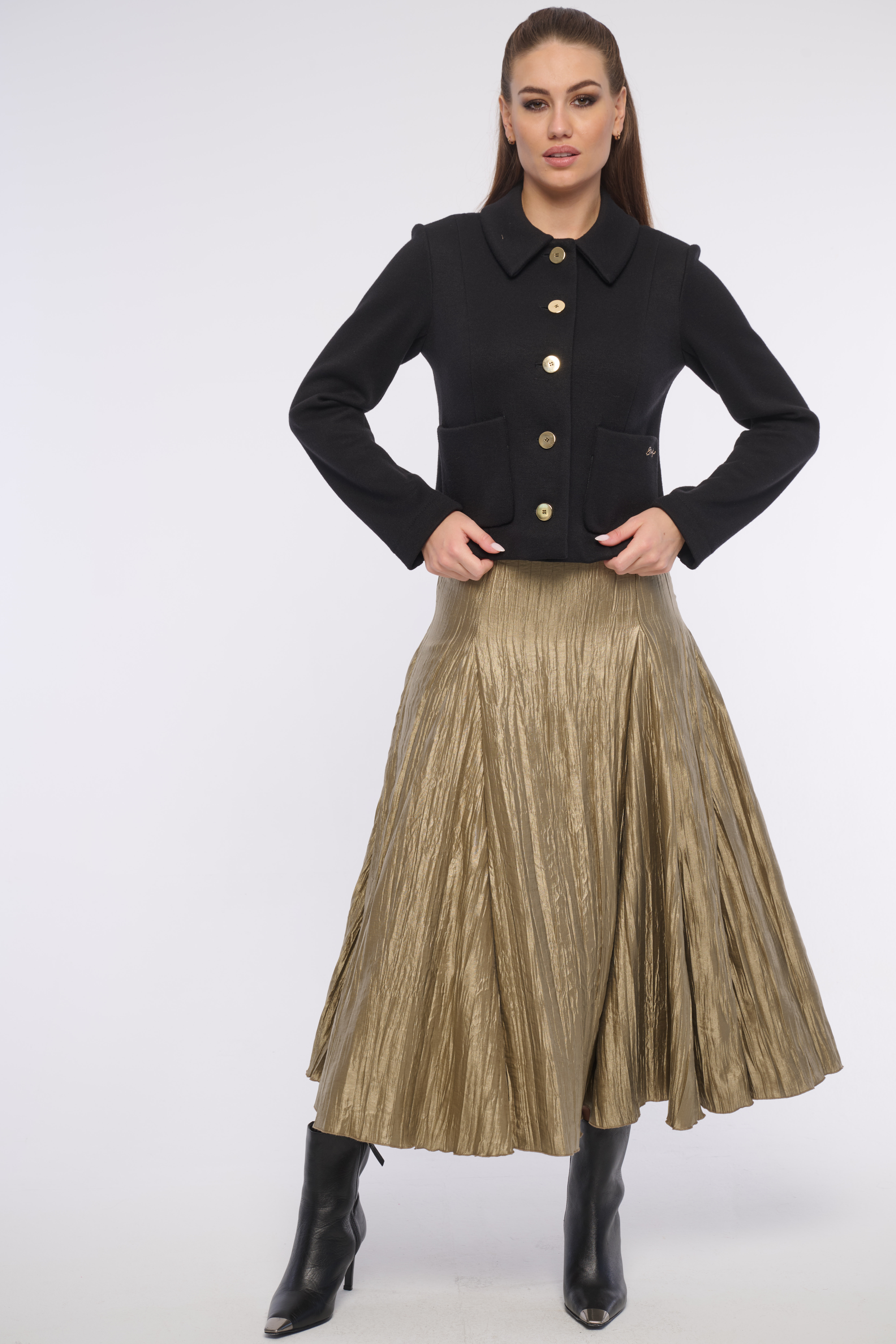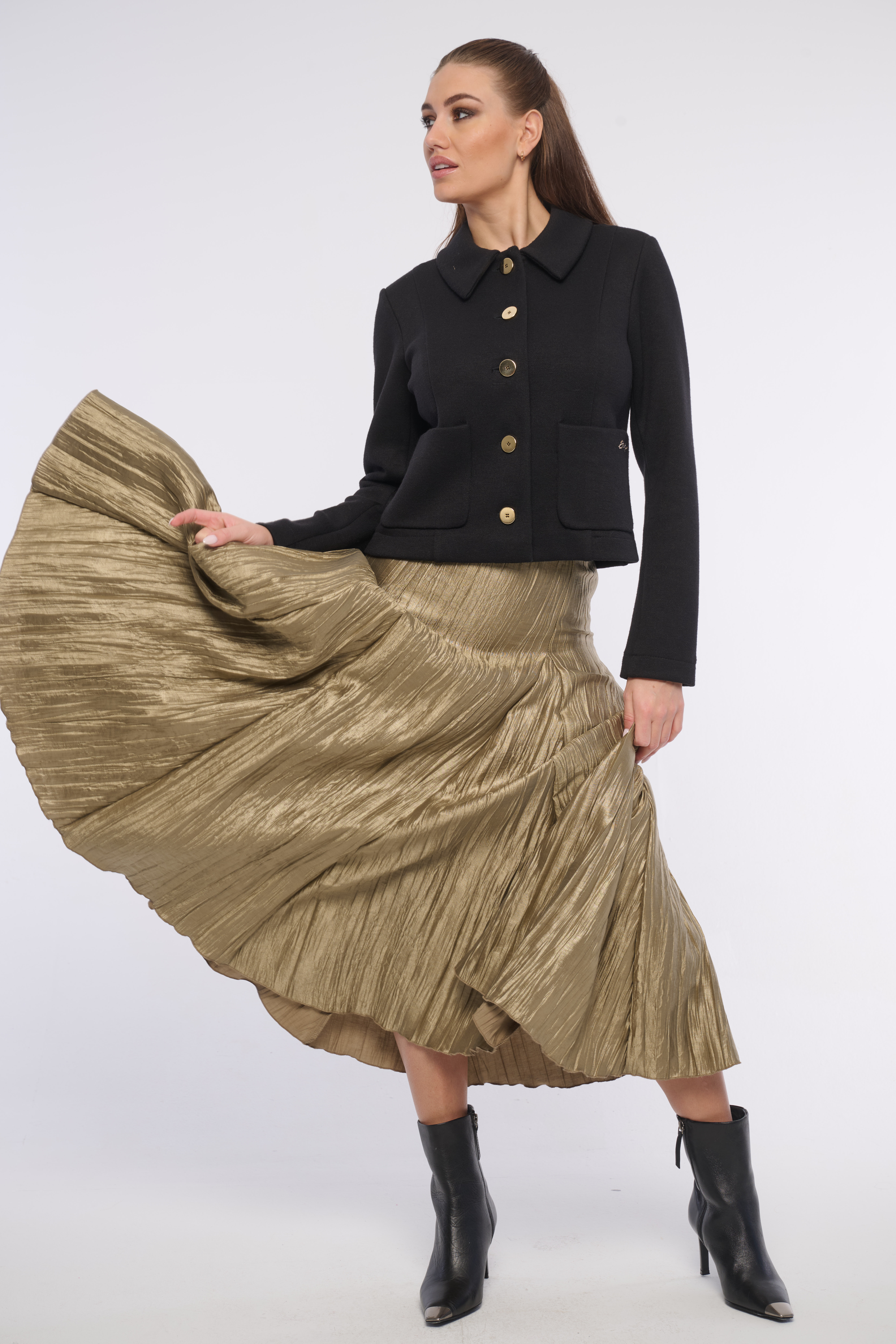 Elegantní krátká bundička s kapsami a výraznými zlatými knoflíky z luxusního materiálu. Detailem na kapse je logo z krystalů Swarovski. Výborně se kombinuje s tričkem i se šaty, vhodná na každou příležitost. Dostupná ve dvou barevných variantách.