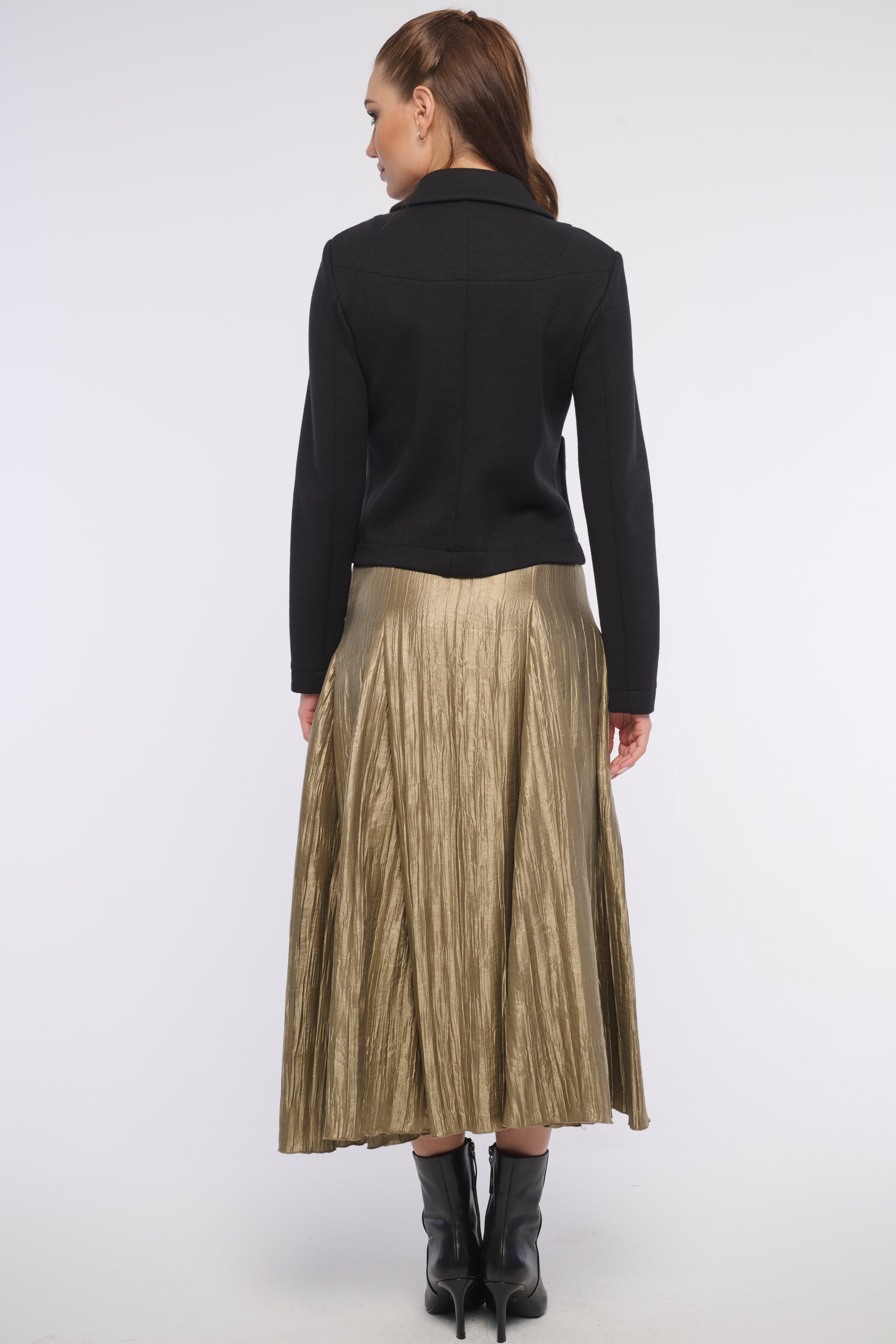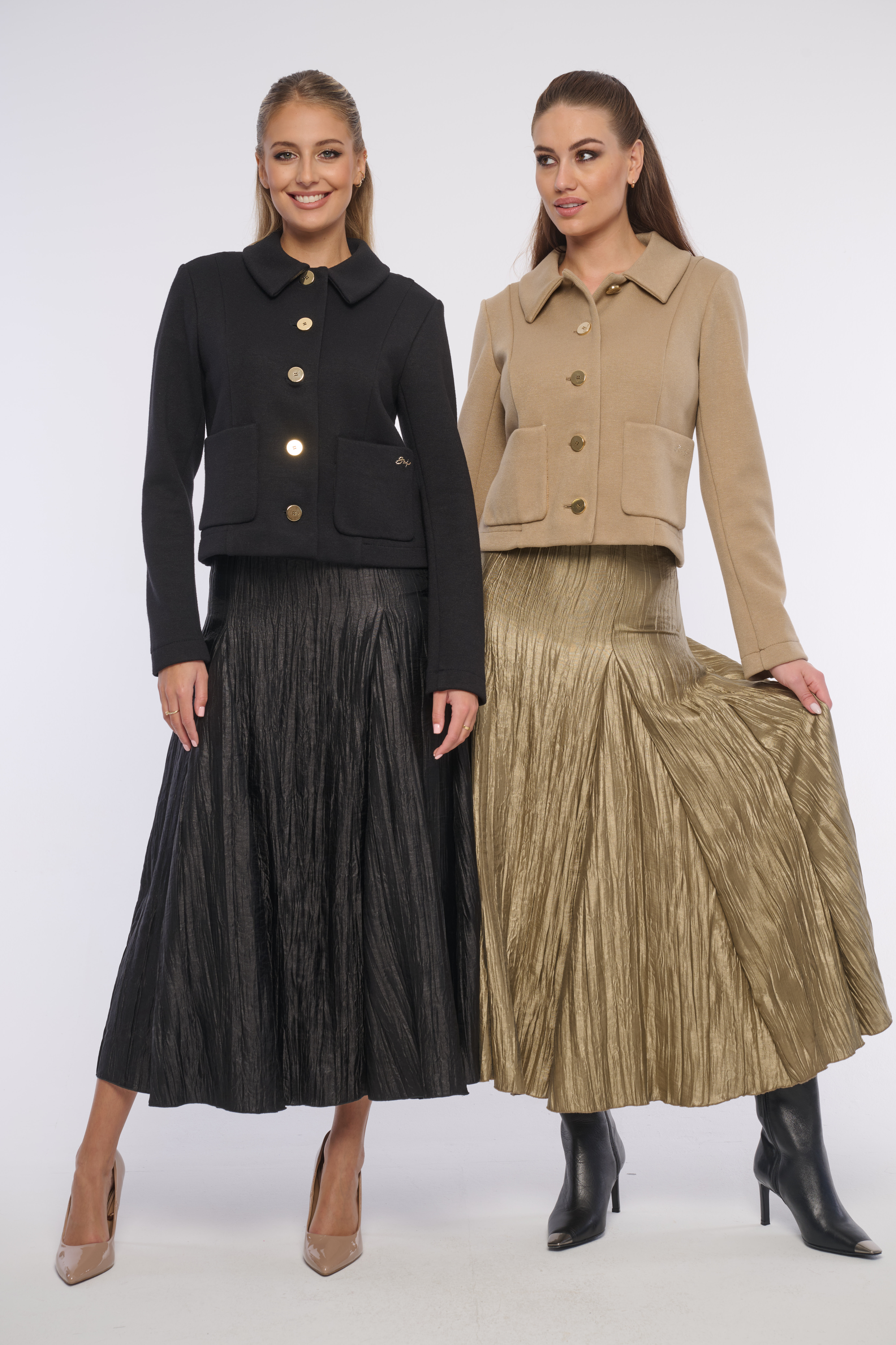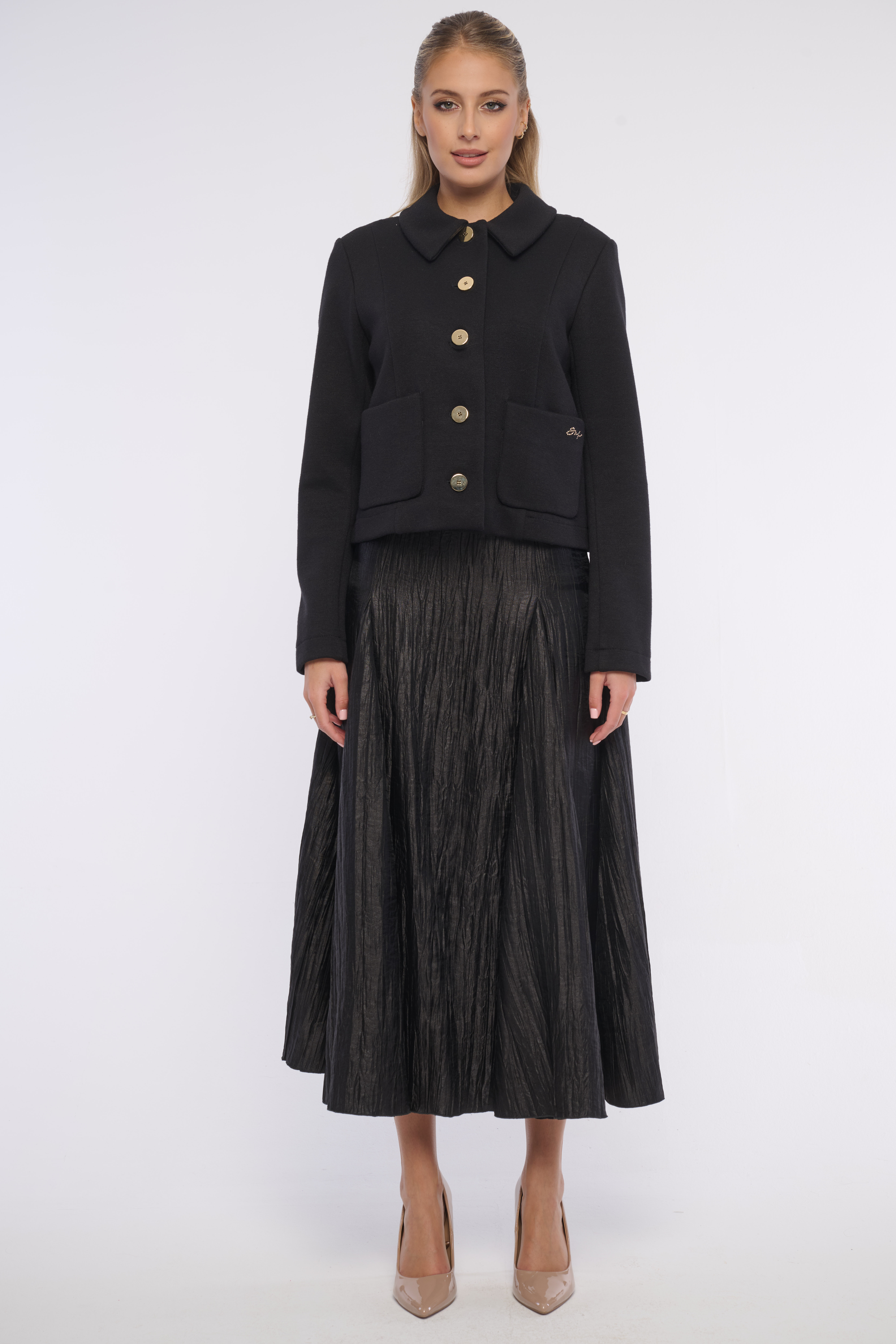 Elegantní krátká bundička s kapsami a výraznými zlatými knoflíky z luxusního materiálu. Detailem na kapse je logo z krystalů Swarovski. Výborně se kombinuje s tričkem i se šaty, vhodná na každou příležitost. Dostupná ve dvou barevných variantách.