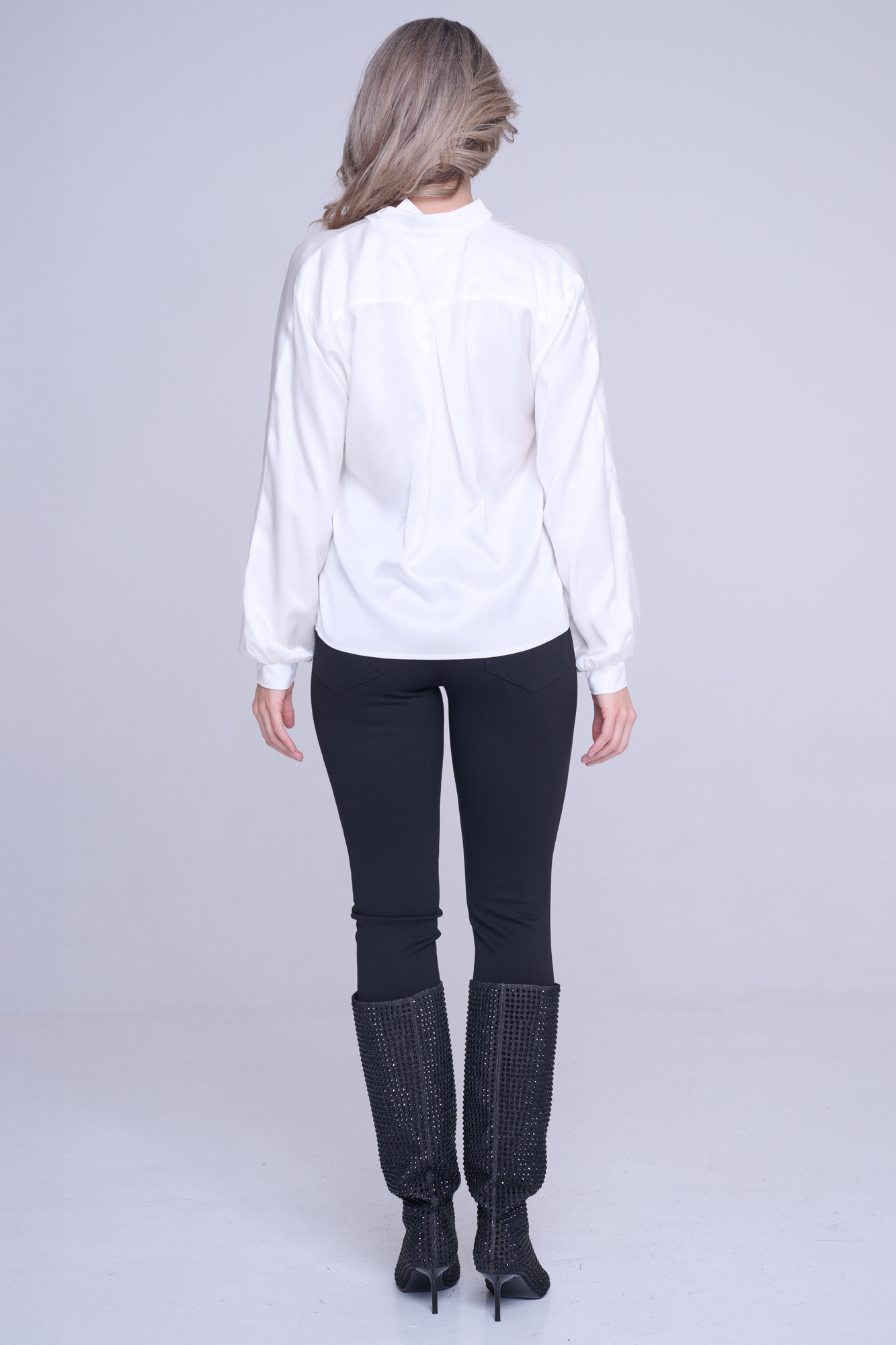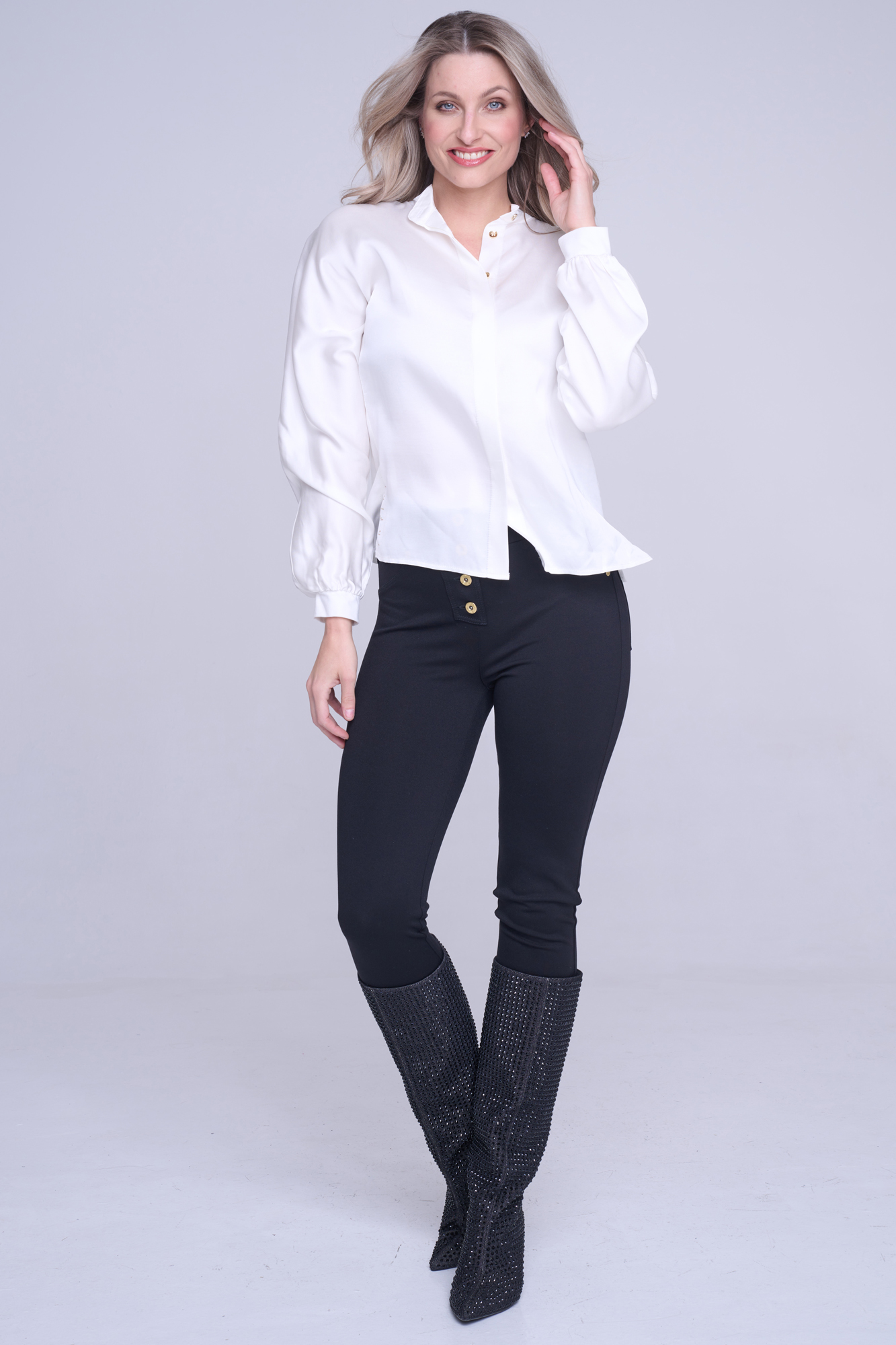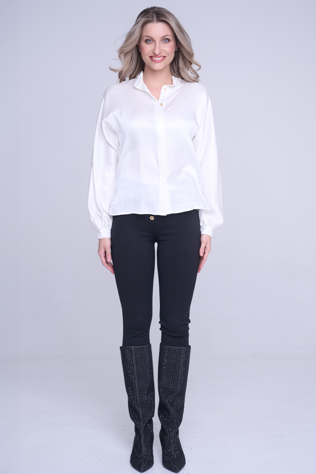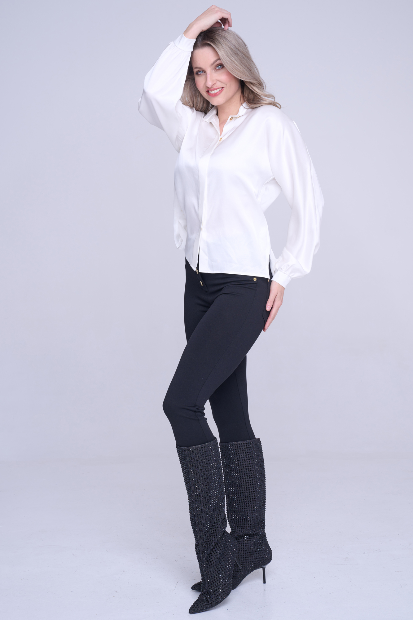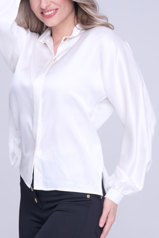 Halenka volnějšího střihu z příjemného viskózového saténu. Zlaté knoflíky. Na předním díle v délce nápis Infinite ze zlatých krystalů.