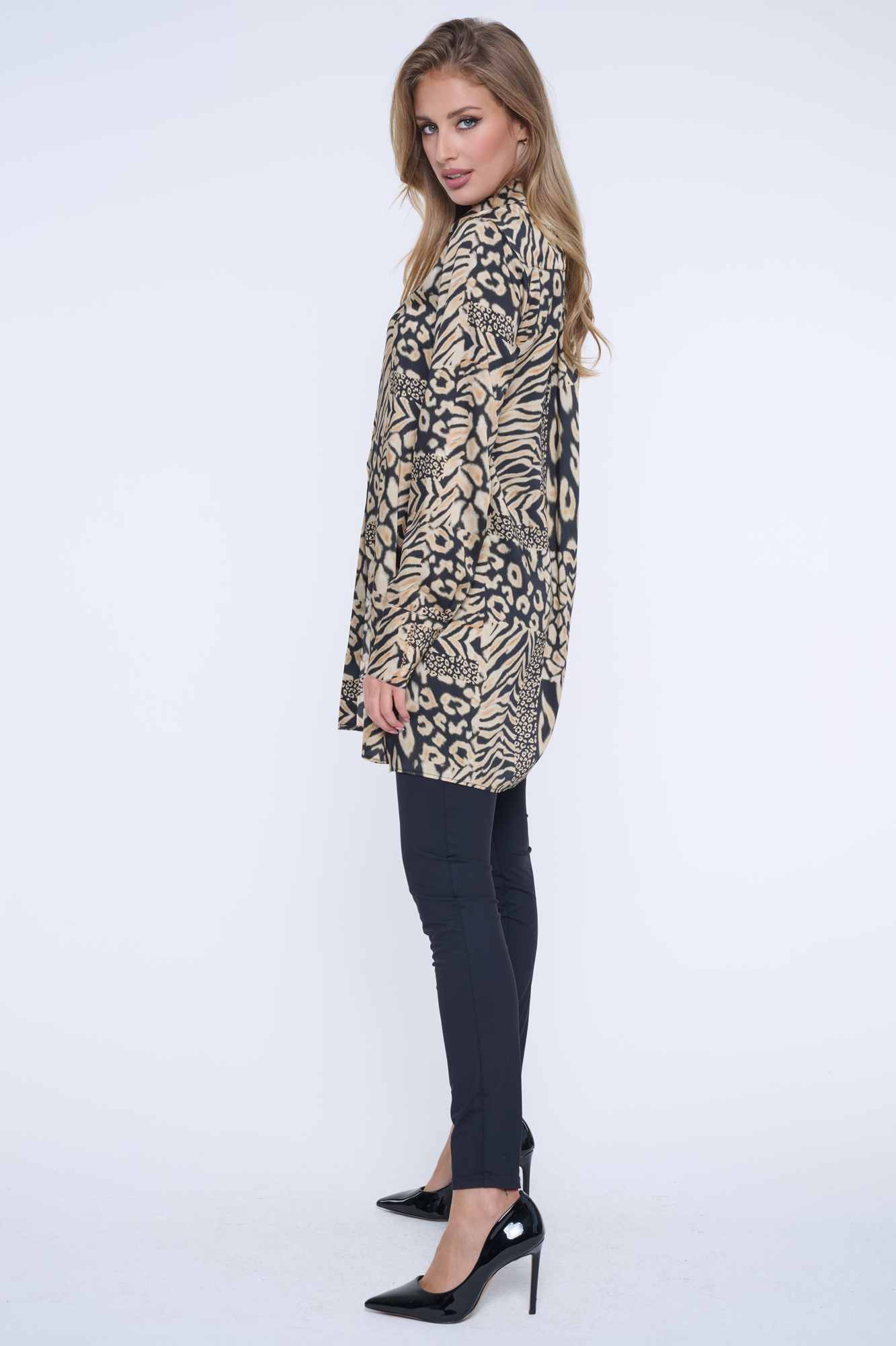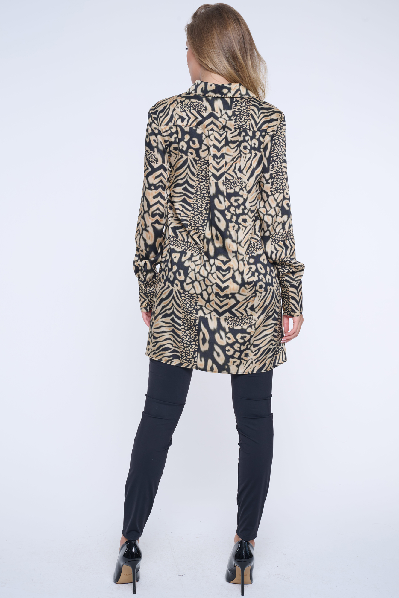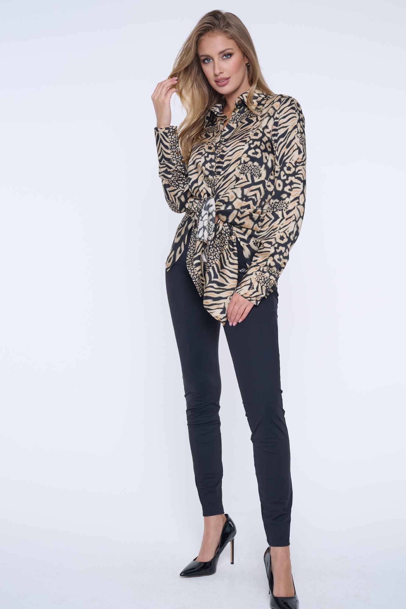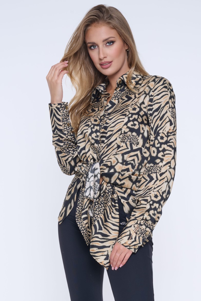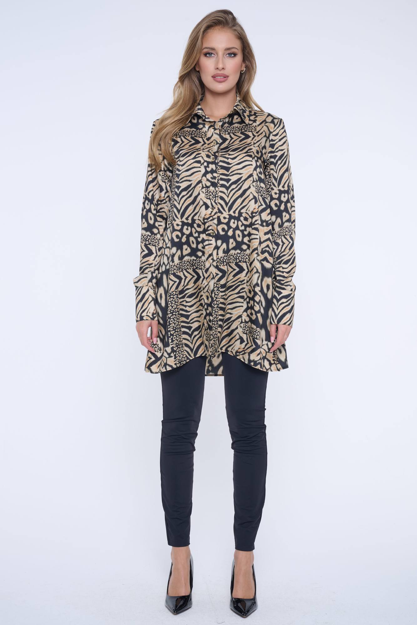 Dlouhá saténová košile ze vzorovaného saténu. Na manžetě rukávu nápis Infinite ze zlatých krystalů Preciosa. Zlaté knoflíky.