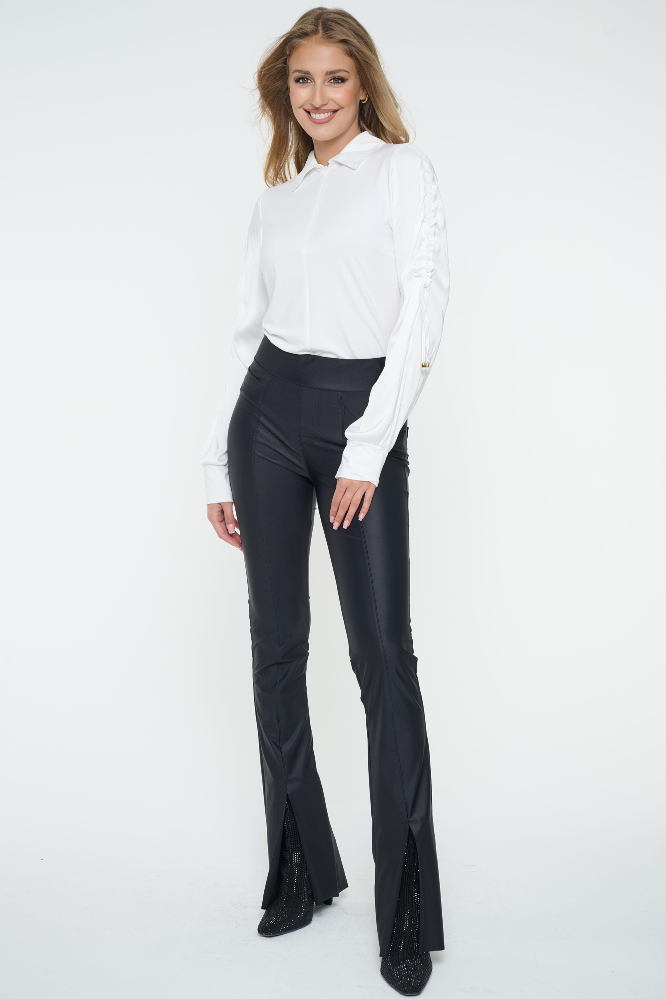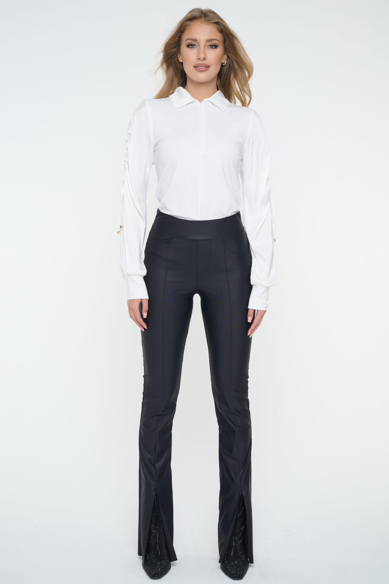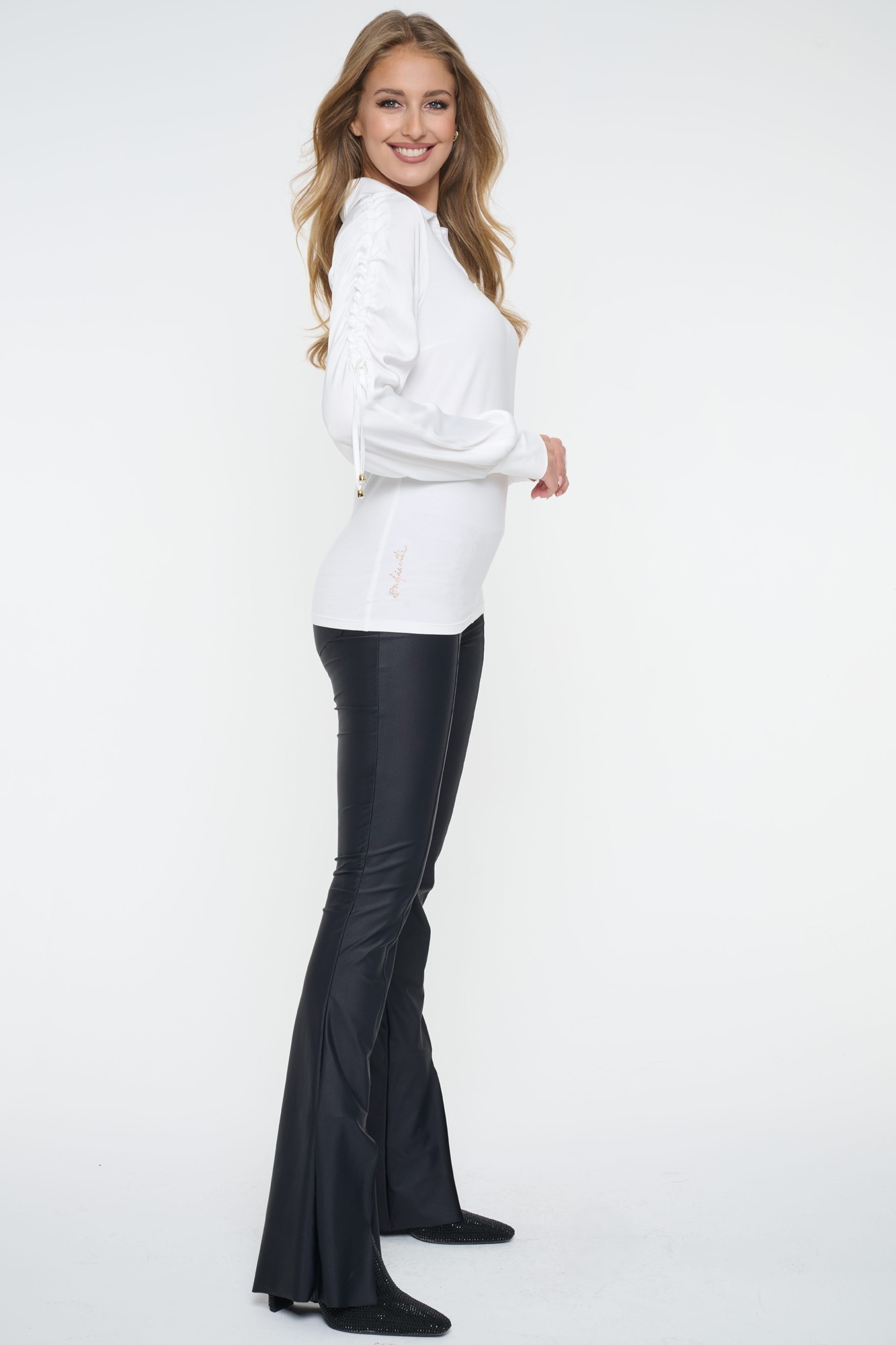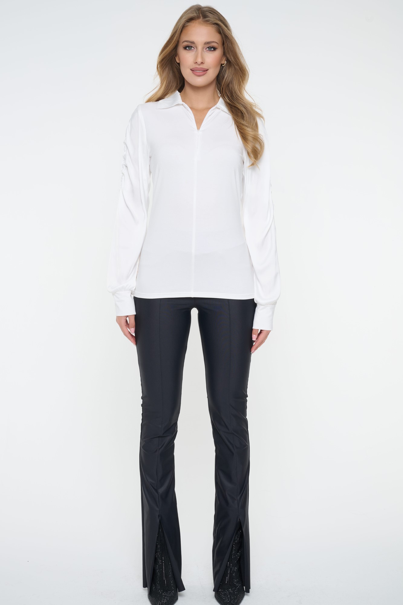 Úpletovo-saténová košile s nařasenými rukávy a ozdobnými stahovacími šňůrkami. Zlatý zip. Zlaté doplňky. Nápis Infinite se zlatých krystalů Preciosa.