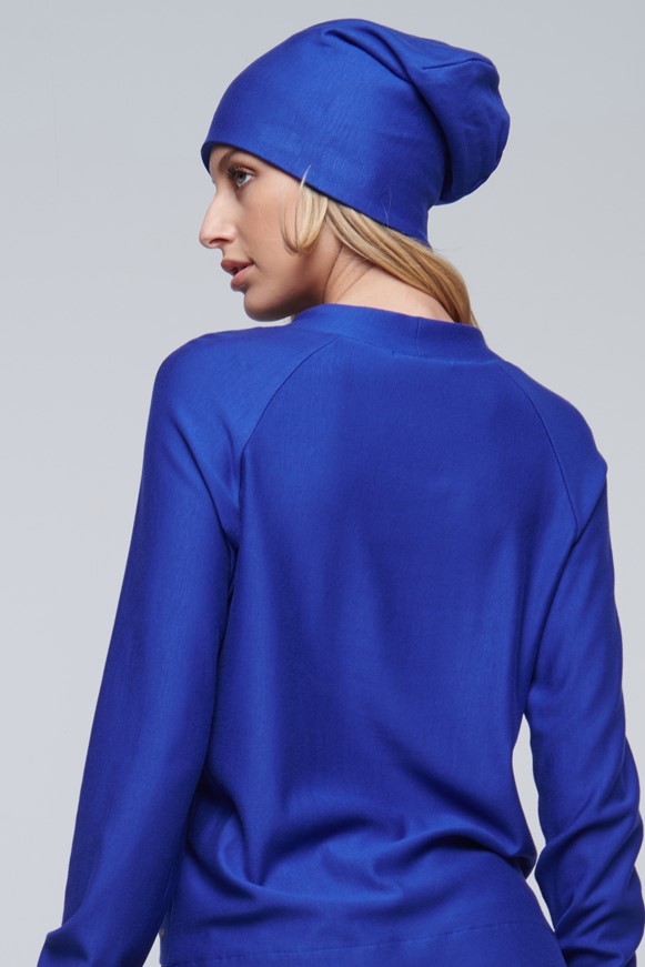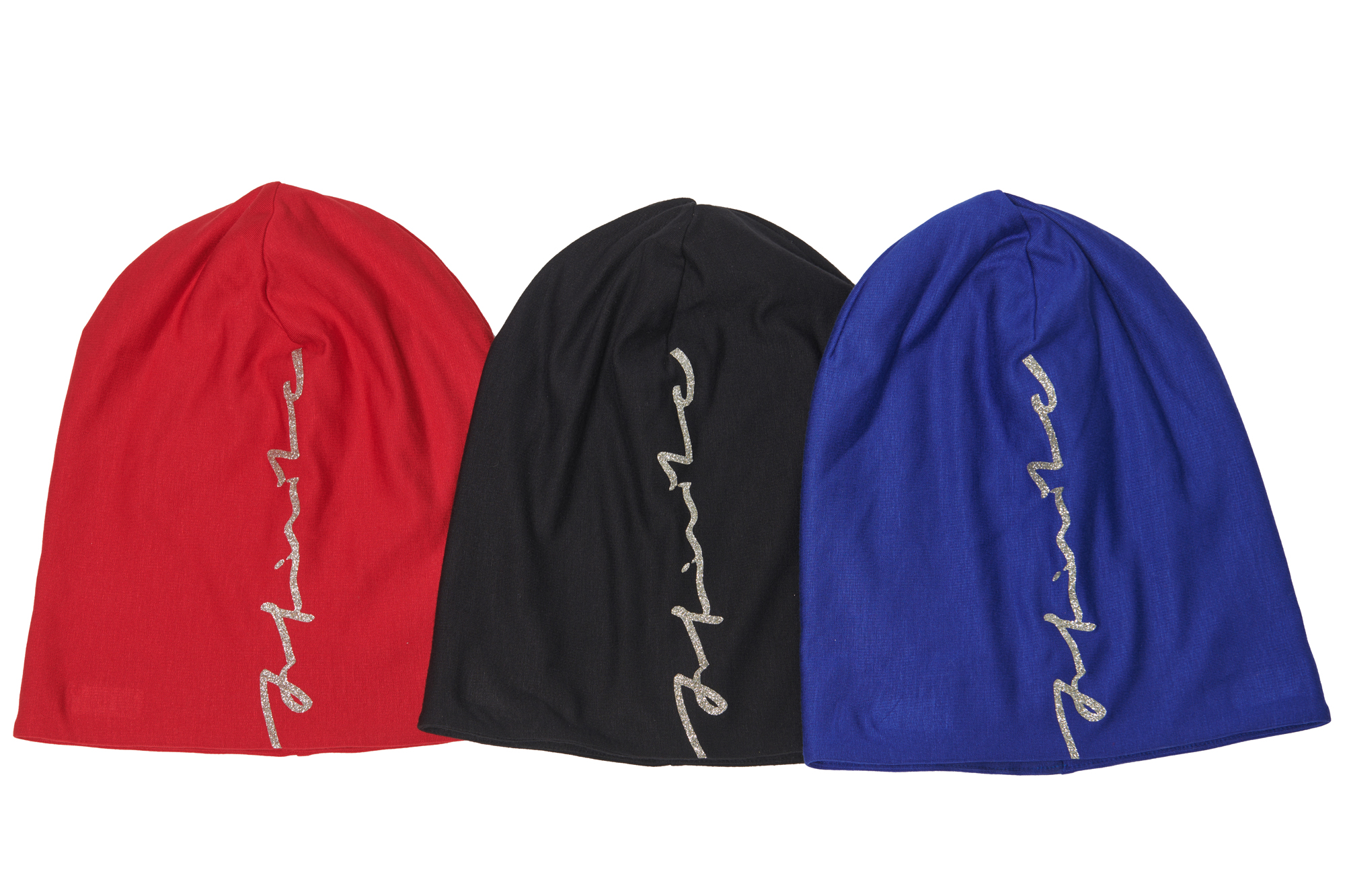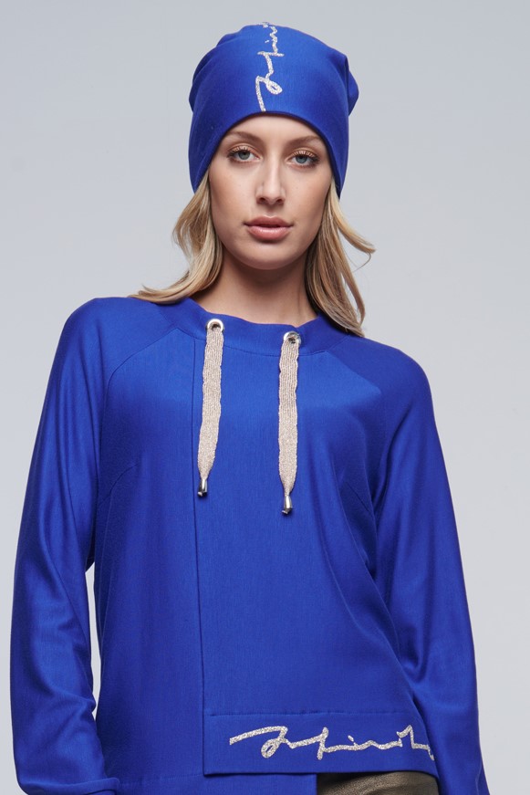 Úpletová čepice se zlatým tiskem INFINITE. Barevně se hodí ke královsky modrým modelům z aktuální kolekce.