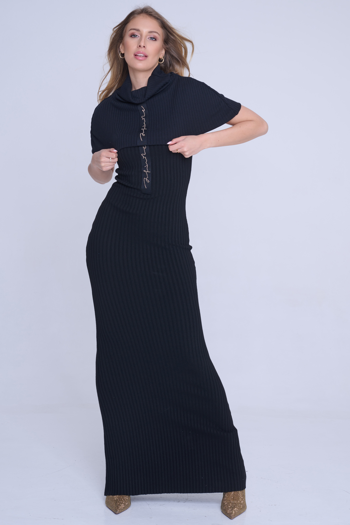 Pončo s efektní černou stuhou s nápisem Infinite se zlatých krystalů Preciosa.