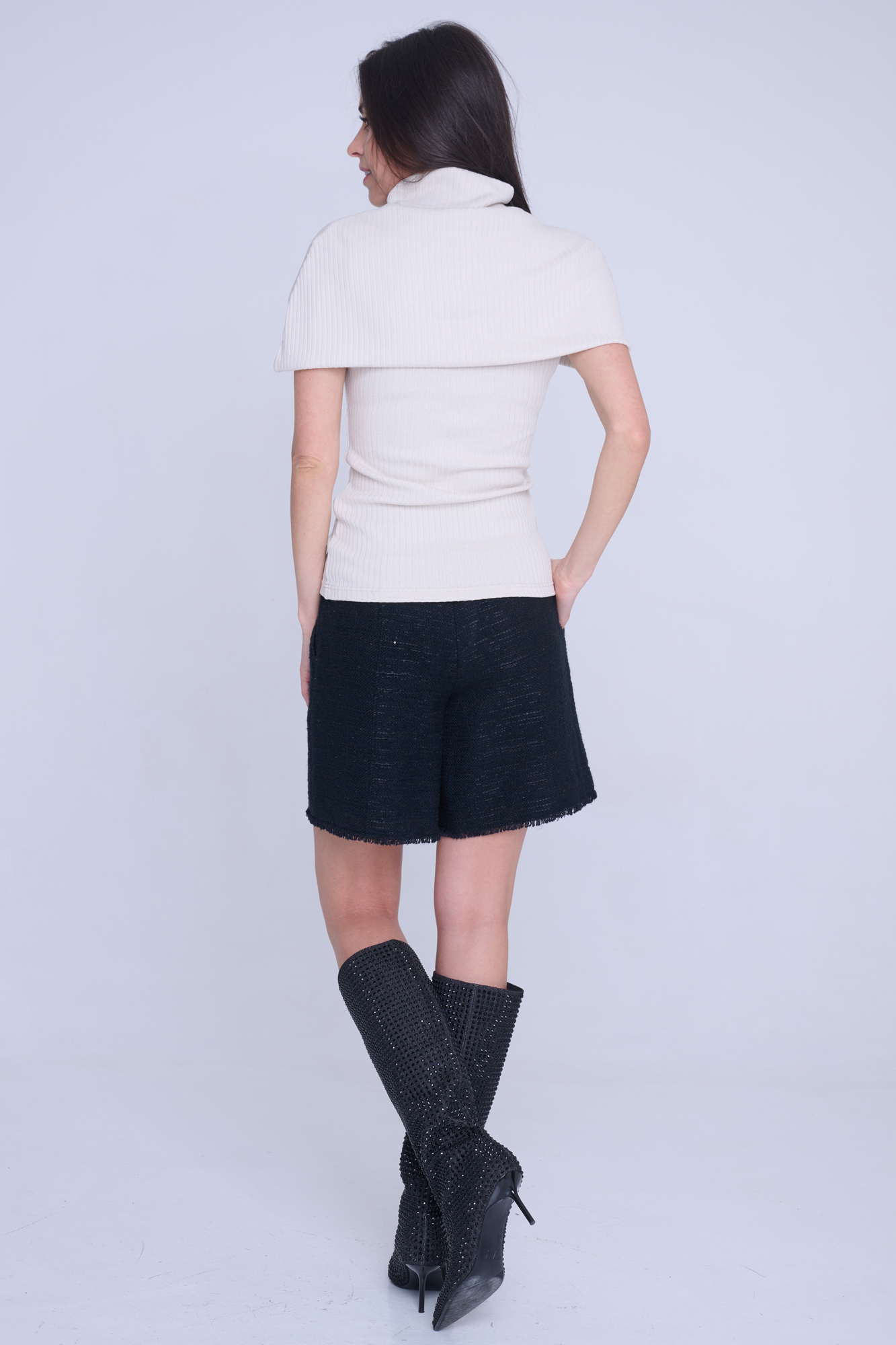 Pončo s efektní černou stuhou s nápisem Infinite ze zlatých krystalů Preciosa.