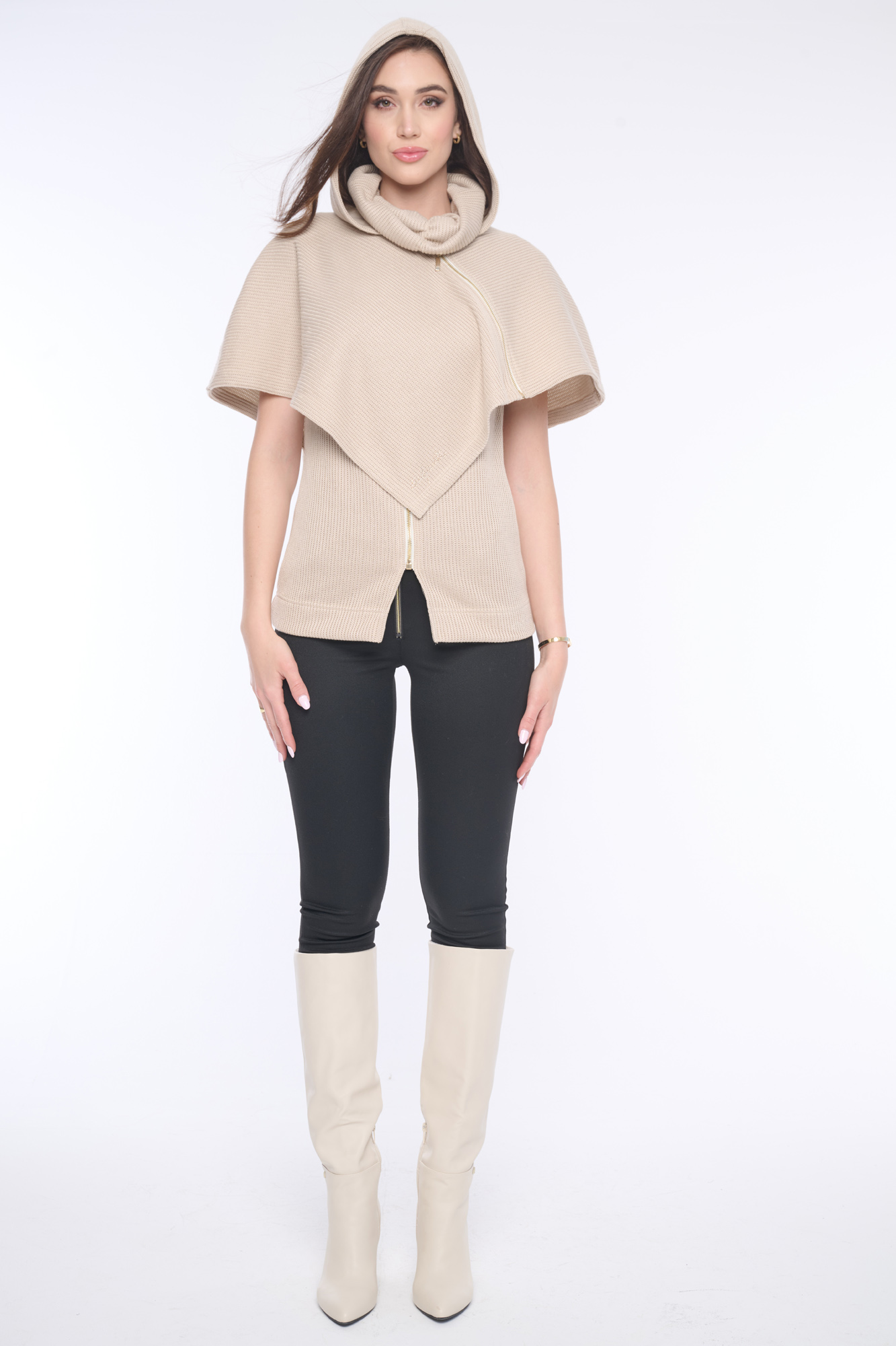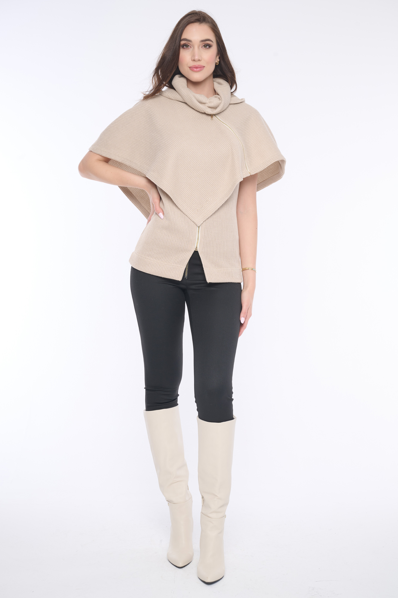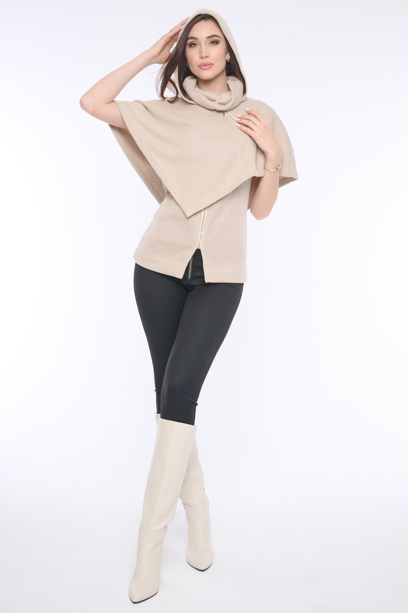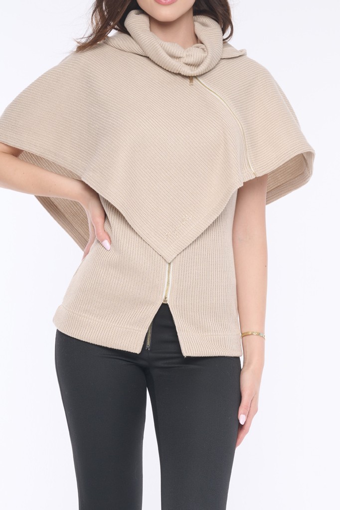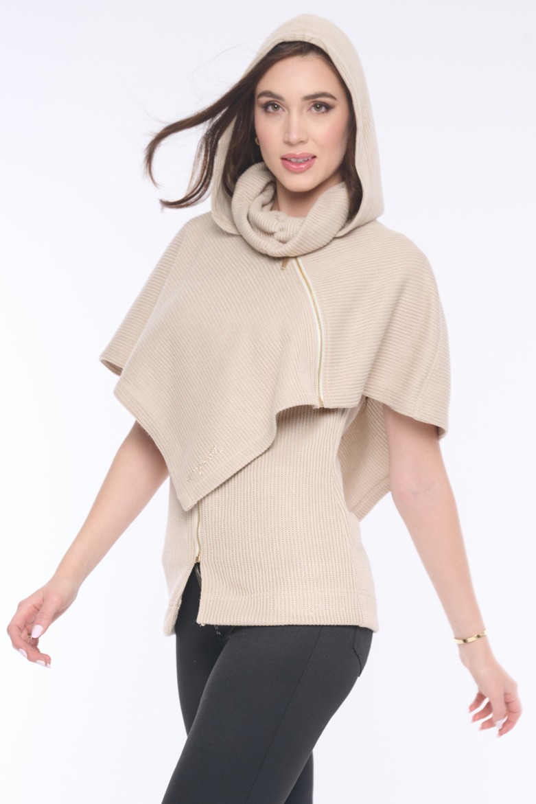 Pončo z příjemného pleteného nekousavého materiálu s kapucí a jemnými krystaly Preciosa. Zajímavým prvkem je funkční zip vedený do boku. Krásně se vrství na naše černé šaty ze stejného materiálu. Dostupné ve dvou barevných variantách.